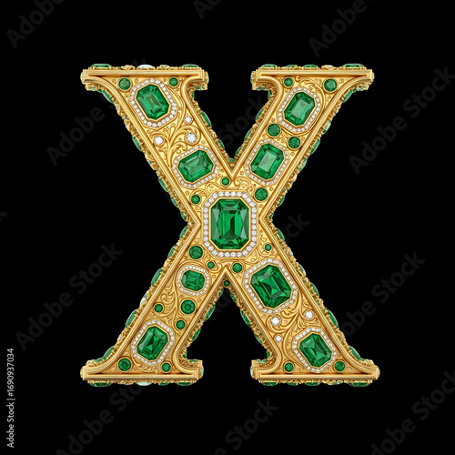 © Md, Fototapeta premium Exquisite golden letter X adorned with emeralds and diamonds, showcasing intricate jewelry design.