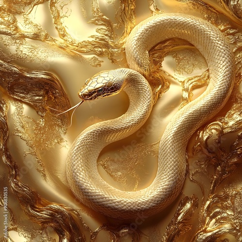 © Nutthanon, Fototapeta premium Exquisite Golden Snake Resting on a Lavish Metallic Background