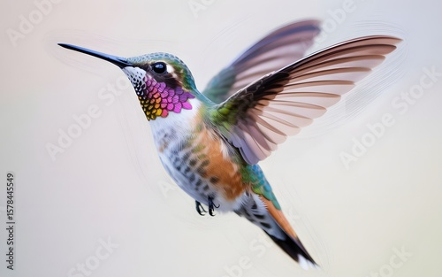 © Mojaher, Obraz premium Exquisite hummingbird in flight showcasing vivid colors and feather detail against soft backdrop