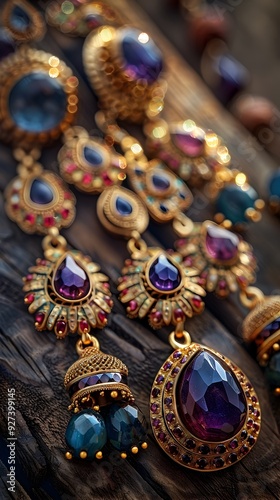 Fototapeta premium Exquisite Indian Jewelry with Vibrant Colors and Intricate Details on Rustic...