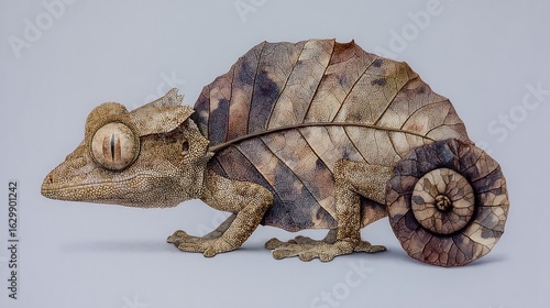 © HIKAM, Obraz premium Exquisite LeafTailed Gecko Camouflaged as a Leaf with on a Plain Background.