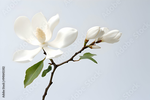 © Umar, Obraz premium Exquisite White Magnolia Blossom with Soft Petals and Delicate Leaves on a Subtle Grey Background"