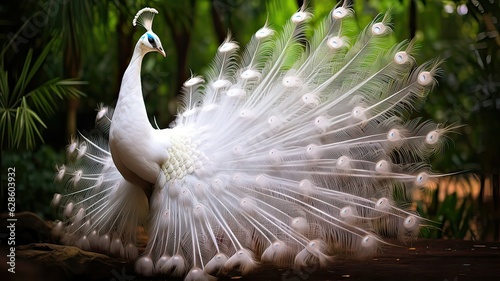 Obraz premium Exquisite white peacock with delicate plumage. Graceful elegance and majestic beauty.