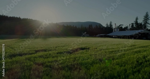 Fototapeta premium Extending green field toward evergreen trees at farm with sun flare, barns,...