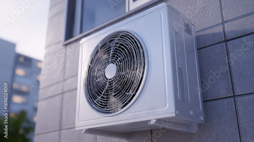 Fototapeta premium Exterior Air Conditioner Unit Mounted on Building Wall Silver Metal Fan...