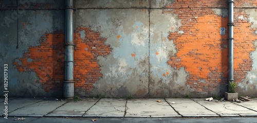 © miss irine, Fototapeta premium Exterior brick wall background with peeling paint and pipes. Grungy urban setting with cracked pavement and some plant life. Offers a raw industrial look.