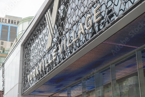 Fototapeta premium exterior building entrance facade and sign of Yorkville Village, a shopping mall, located at 55 Avenue Rd, Toronto