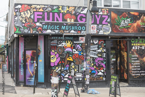 © eugen, Naklejka premium exterior building facade and painted sign of FUNGUYZ - Magic Mushrooms Dispensary, a herbal medicine store, located at 181 Baldwin St, Kensington Market, Toronto