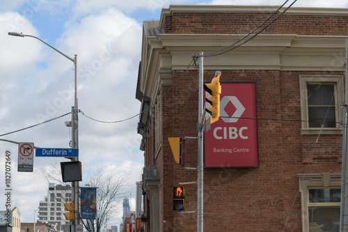 Fototapeta premium exterior building facade and sign at CIBC Branch with ATM located at 1129 Bloor St W, Toronto