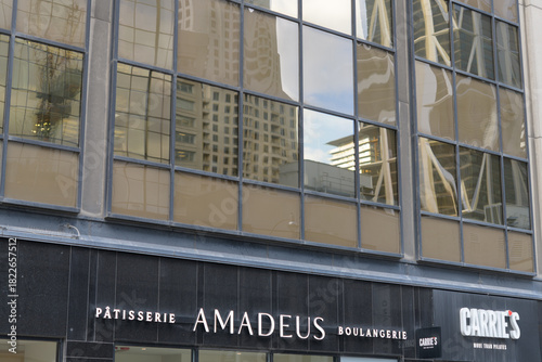 Obraz premium exterior building facade and sign of Amadeus Patisserie, a bakery, located at 1235 Bay St, Toronto