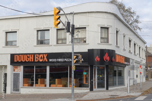© eugen, Fototapeta premium exterior building facade and sign of DoughBox Wood Fired Pizza & Pasta, a pizza restaurant, located at 1466 Eglinton Ave W, Toronto