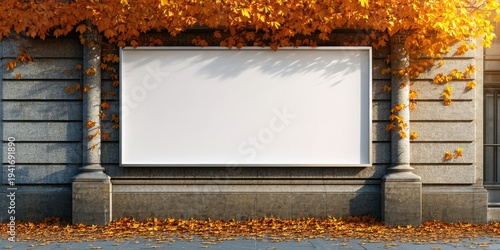 © antishock, Fototapeta premium Exterior building facade. Blank billboard framed by columns, covered with autumn foliage. Leaves scattered on ground below. Sunlight creates shadows.