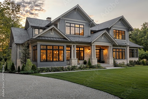 © Adnan saheem, Obraz premium Exterior design of a home with matte gray accents, traditional architecture, including granite and cedar details, sweeping windows, chalk roof trim, a gravel driveway, and a well-maintained front lawn