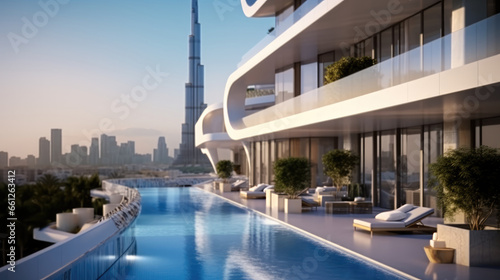 Fototapeta premium Exterior design of a luxury building with pool, City view.