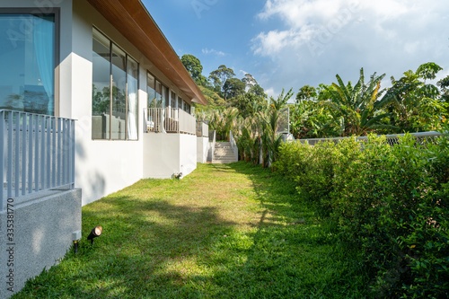 Naklejka premium Exterior design of villa, house and home feature landscape and green garden beside the house