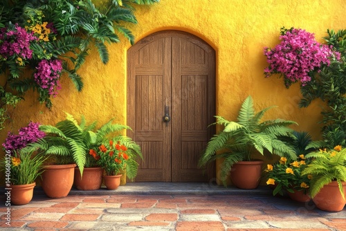 Fototapeta premium Exterior facade of a vibrant yellow building with a wooden door and lush...