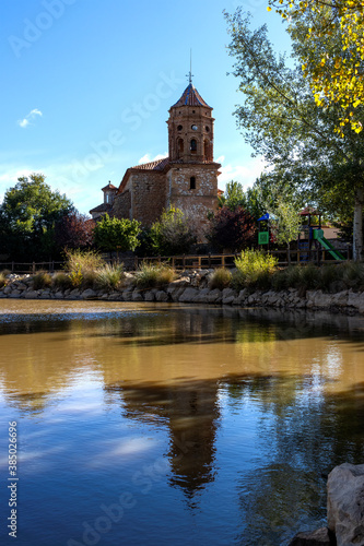 © Sendo, Naklejka premium Exterior facade of the Church of San Sebastian S XVIII next to a pond