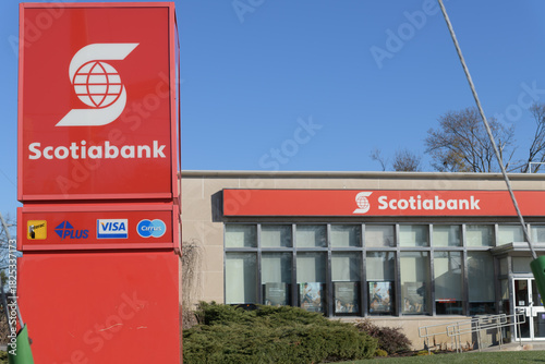 Obraz premium exterior location marker and building facade with sign of Scotiabank branch...