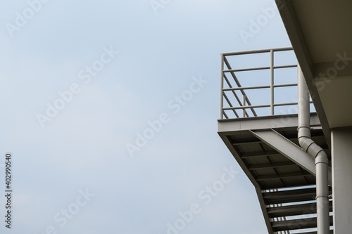 Fototapeta premium Exterior metal staircase of the building with cloud sky in background....