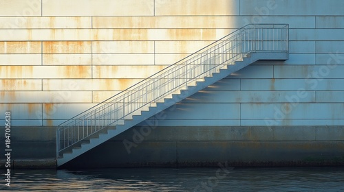 © TITISCAHYA, Fototapeta premium Exterior metal stairs beside a weathered wall near water