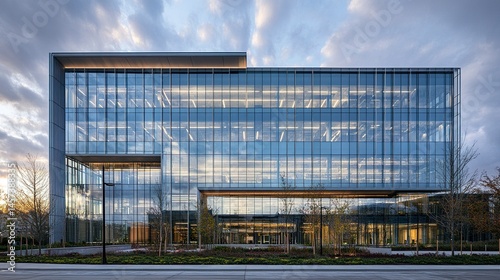 Fototapeta premium Exterior of a tall modern building with a seamless glass facade, highlighting cutting-edge architectural trends in urban environments.