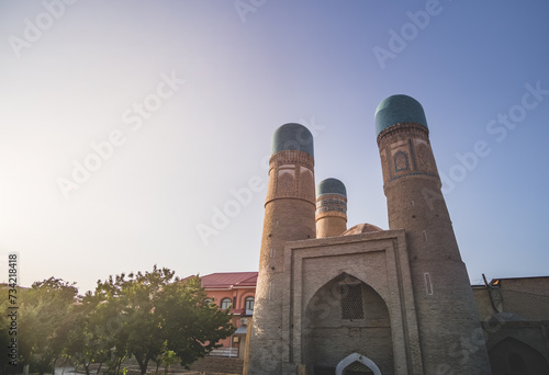 Fototapeta premium Exterior of Chor Minor Madrasah in the ancient city of Bukhara in Uzbekistan, oriental architecture at sunset in the evening