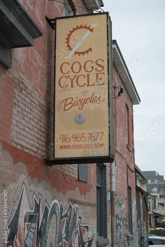 © eugen, Obraz premium exterior projecting sign of Cogs Cycle located at 1 Howland Rd, on Gerrard St E, Toronto