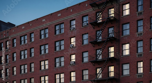 © Anggun, Fototapeta premium Exterior view of a brick apartment building with fire escape and illuminated windows.