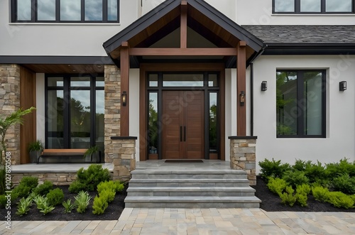 © Mazo, Fototapeta premium Exterior view of a Georgian-style cottage with stone steps leading to a wooden door and a charming gabled porch.