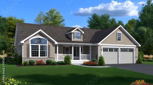 © kirania, Obraz premium Exterior view of a light taupe colored home design.