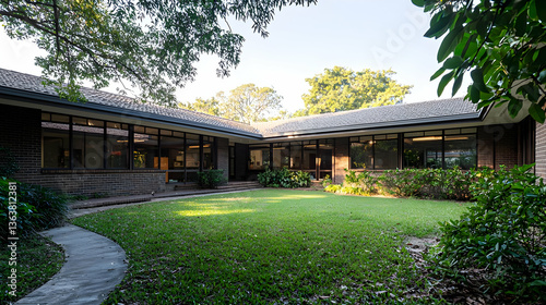 © artzone, Fototapeta premium Exterior View Of A Modern Residential House With Lush Green Garden And Pathway Leading To Entrance On A Sunny Day