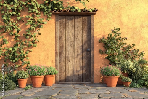 © MrHamster, Fototapeta premium Exterior view of a rustic terracotta colored house with a wooden door and garden.