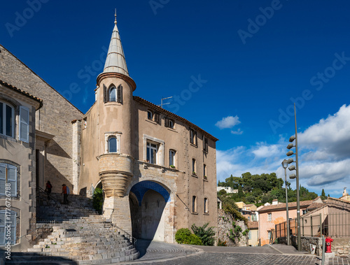 © majonit, Fototapeta premium Exterior view of the Peñiscola building in Hyères, France, with its porch built in the 16th century ahead of the Saint-Paul gate