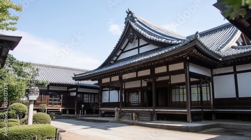 © zaen_studio, Obraz premium Exterior view of traditional Japanese architecture in Kyoto, showcasing intricate roof details and serene garden surroundings during daylight