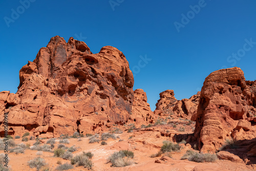 © Chris, Fototapeta premium Exterior view of windstone arch and fire cave in Valley of Fire State Park, Mojave desert, Nevada, USA. Scenic view of beehive shaped red sandstone rock formations. Barren deserted landscape in summer