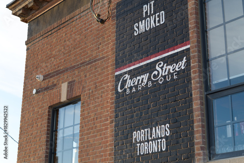 © eugen, Obraz premium exterior wall sign at Cherry Street Bar-B-Que, a barbecue restaurant, located at 275 Cherry St, Port Lands, Toronto