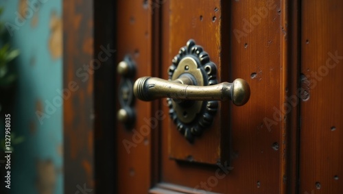© AIArtistry, Fototapeta premium External door handle lacking protective lock on wooden frame. Close-up of metallic door handle on brown front or interior door. Concept of home door design choices.