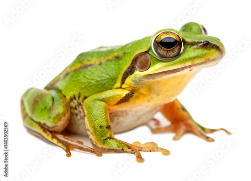 © Natdanai, Naklejka premium Extreme close up and right side view photo of single green frog isolated and generated with AI in png file format