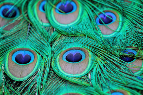 Fototapeta premium Extreme close-up details of an Indian male peacock (Pavo cristatus) tail quill feathers, selective focus.