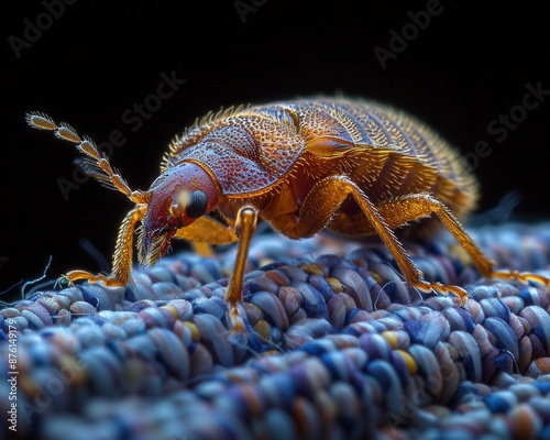 Naklejka premium Extreme Close-up Macro Shot of a Bed Bug Crawling on Mattress Seam Showcasing...