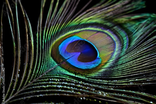 © You are the best, Naklejka premium Extreme close up macro shot of a vibrant peacock feather eye on black background