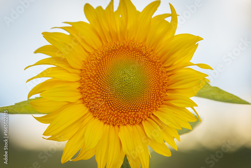 © Emvats, Fototapeta premium Extreme close-up of a bright sunflower showing intricate details of the seed pattern and yellow petals, set against a soft blue sky background.