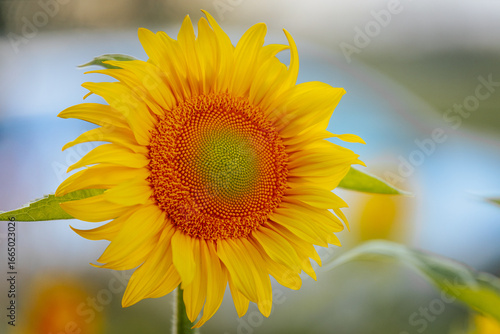 © Emvats, Fototapeta premium Extreme close-up of a bright sunflower showing intricate details of the seed pattern and yellow petals, set against a soft blue sky background.