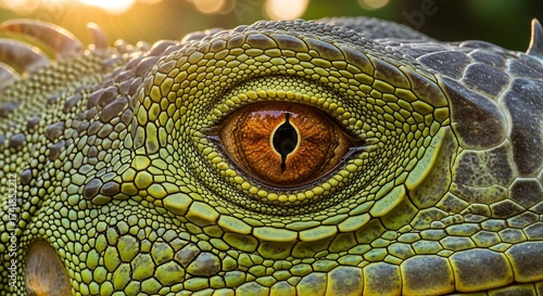 © Bila, Fototapeta premium Extreme Close-Up of a Green Iguana's Eye and Scaly Skin in Golden Hour Sunlight