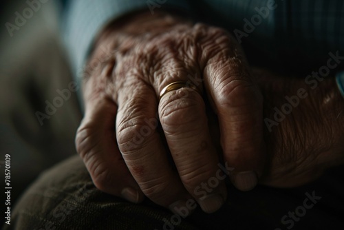 © Maelgoa, Fototapeta premium Extreme close-up of a man's hand removing his wedding ring, under harsh lighting, depicting the pain of letting go 03
