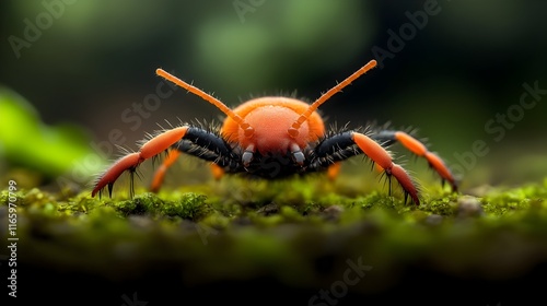 © Bos Amico, Naklejka premium Extreme close up of a mite s venomous chelicerae releasing distress signals to alert the colony dramatic chiaroscuro macro scientific forest floor setting