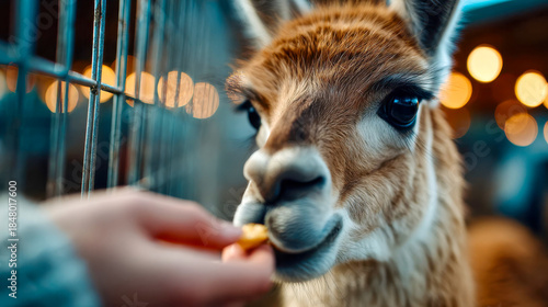 © Aliaksandra, Obraz premium Extreme close-up of an alpaca eating hay, highlighting texture, fur details, and gentle animal behavior