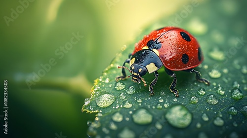Naklejka premium Extreme close-up of seven-spotted ladybug on textured green leaf, showcasing vibrant red and black colors with natural sunlight and dewdrops in garden setting.
