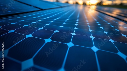 © HuynhThiThuy, Obraz premium Extreme close-up of solar panel surface, clean blue crystalline pattern with sun glare casting reflections. Captured straight-on with neutral sky reflection.