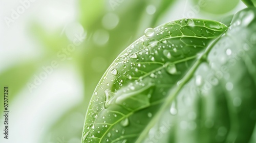 © BGSTUDIOX, Fototapeta premium Extreme close-up of wet kiwi plant leaves, soft white blurry background, rain drops, vibrant and exotic composition.